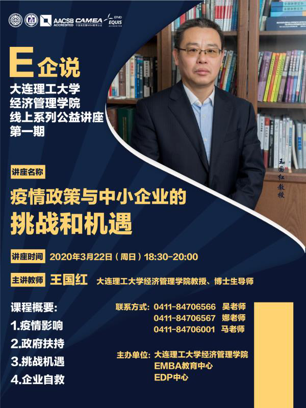 2020年突如其来的“新冠”肺炎疫情,不仅严重危害了人们的生命健康,还使整个中国社会一度停摆,无数企业陷入生存困境。面对未来经济发展不确定性持续发酵的考验,无论是企业还是公民,不仅需要有团结起来直面困难的信心和勇气,更需要认识疫情作用于社会经济发展的各种机理,并建立与复杂环境相处的能力,求得生存机会。基于此,大连理工大学经济管理学院EMBA教育中心精心组织,推出“E”企说线上系列公益讲座,打破时空的限制,传递知识的力量。我们一起共克时艰,取得“战疫”全面胜利!