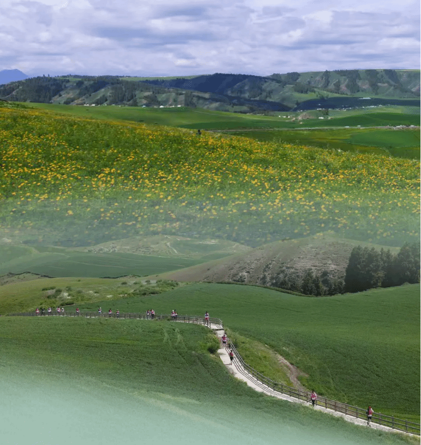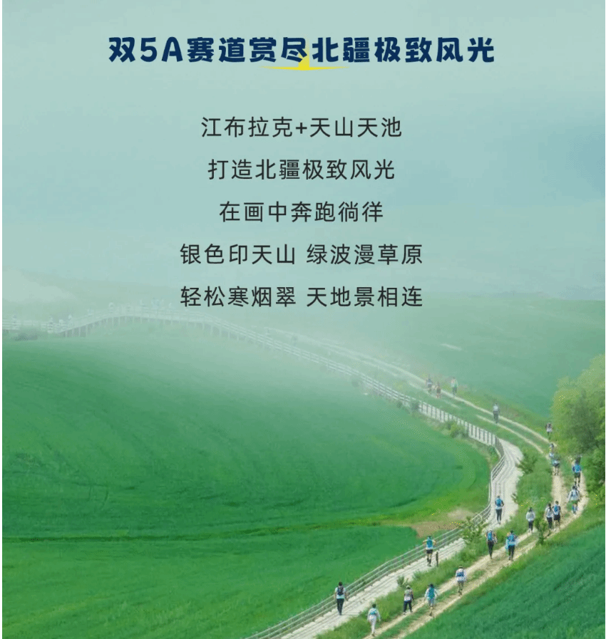 基本覆盖新疆除沙漠外的地形地貌,包括空中草原、丛林、湖泊、戈壁、峡谷等,更可现场领略雪山奇景,体验大自然的鬼斧神工,被称为"商学院最美越野跑赛道"。